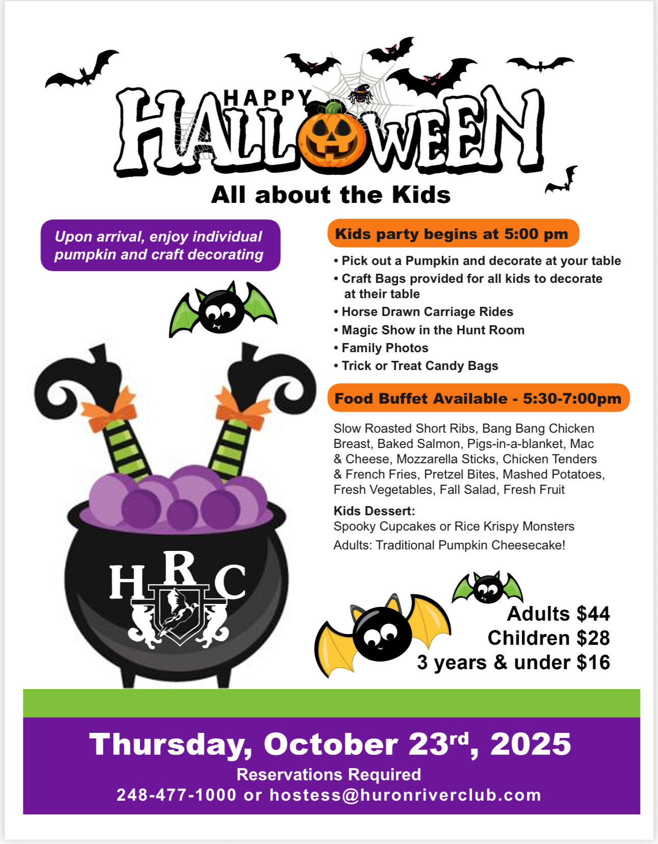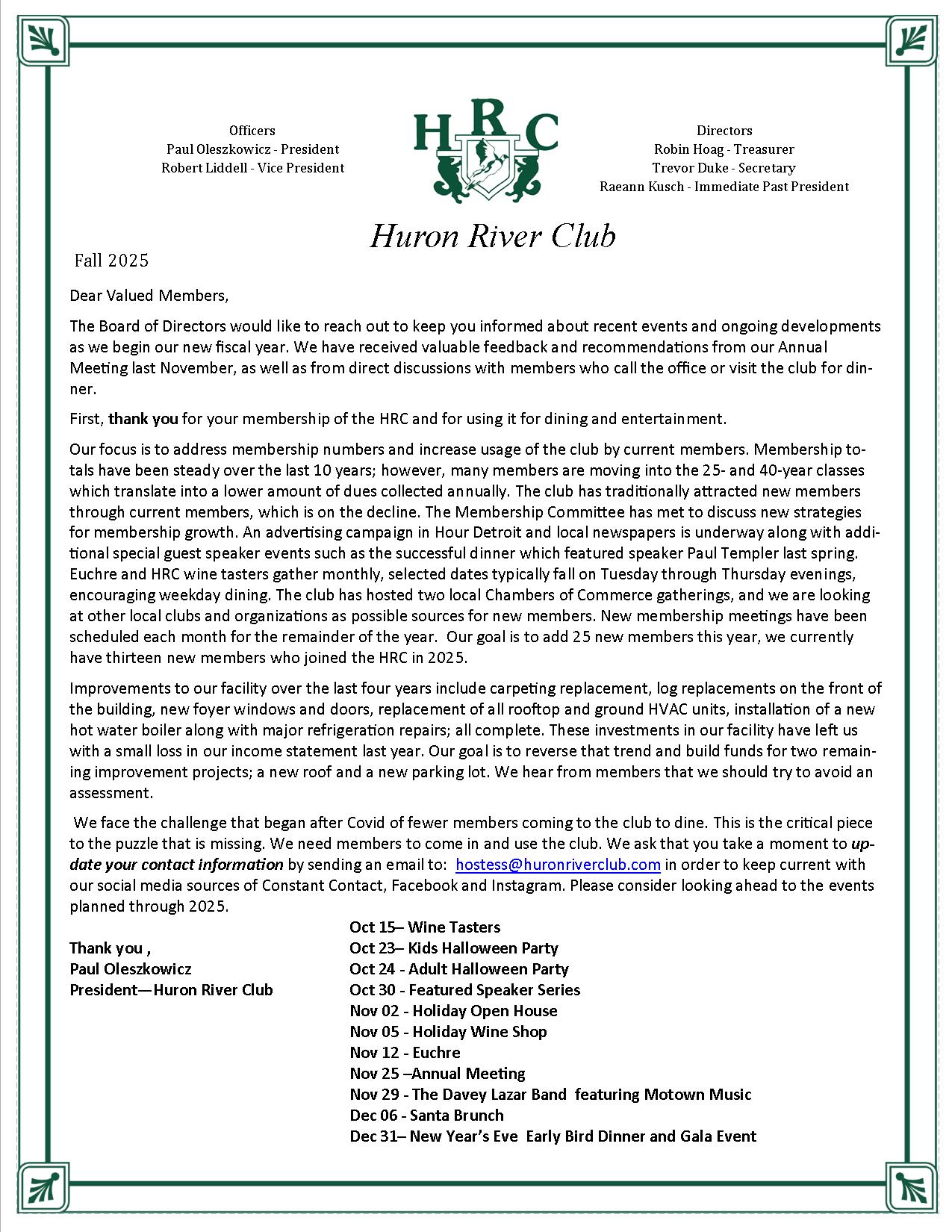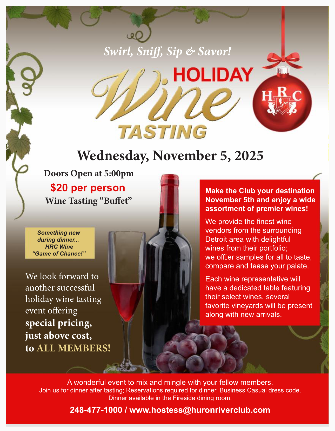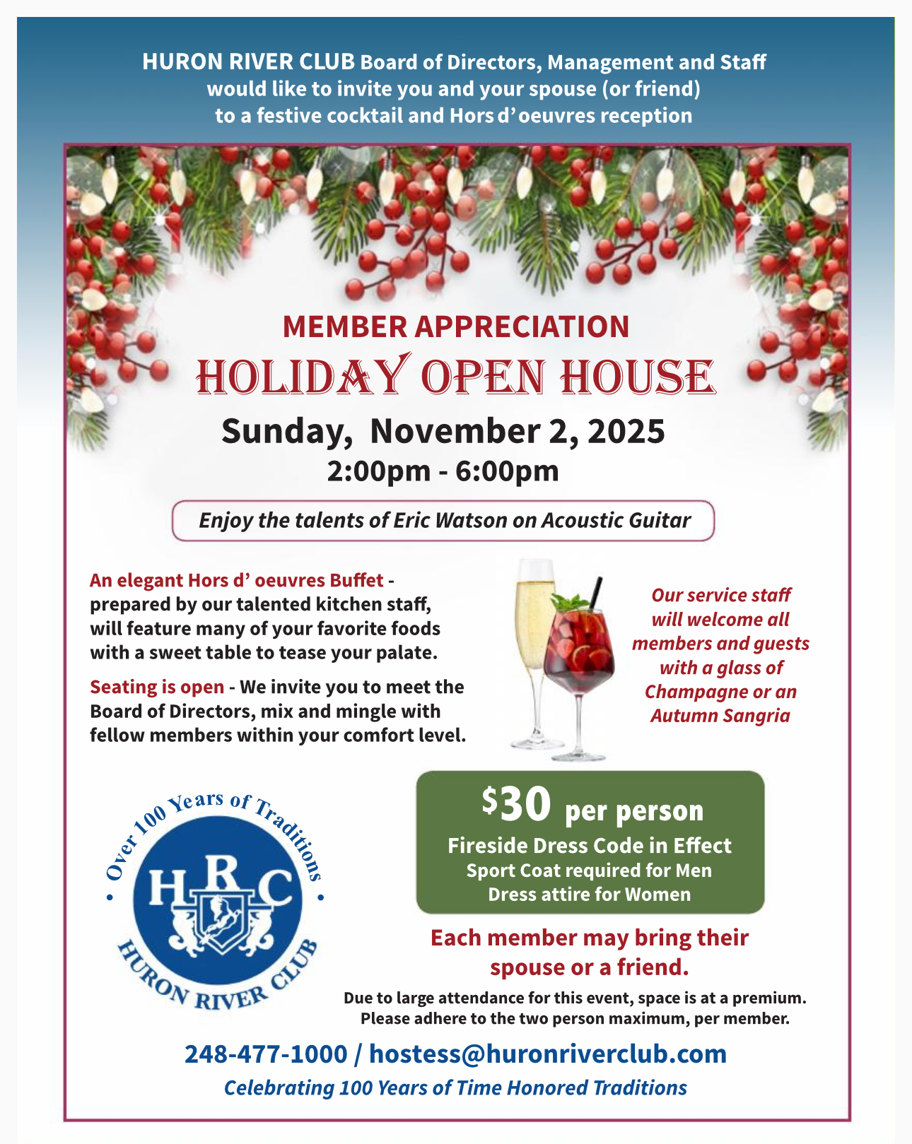 Sunday, November 2nd, 2025 from 2:00pm - 6:00pm Huron River Club Board of Directors, Management and Staff would like to invite you and your spouse (or friend) to a festive cocktail and Hors d'oeuvres reception featuring many of your favorite foods with a sweet table...