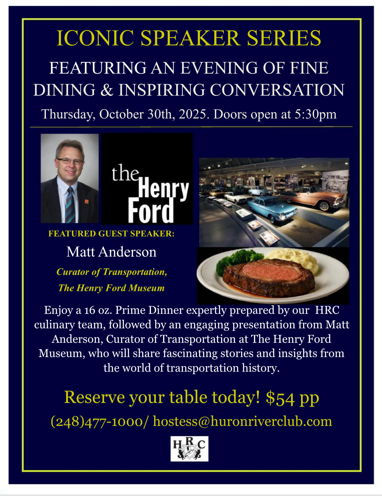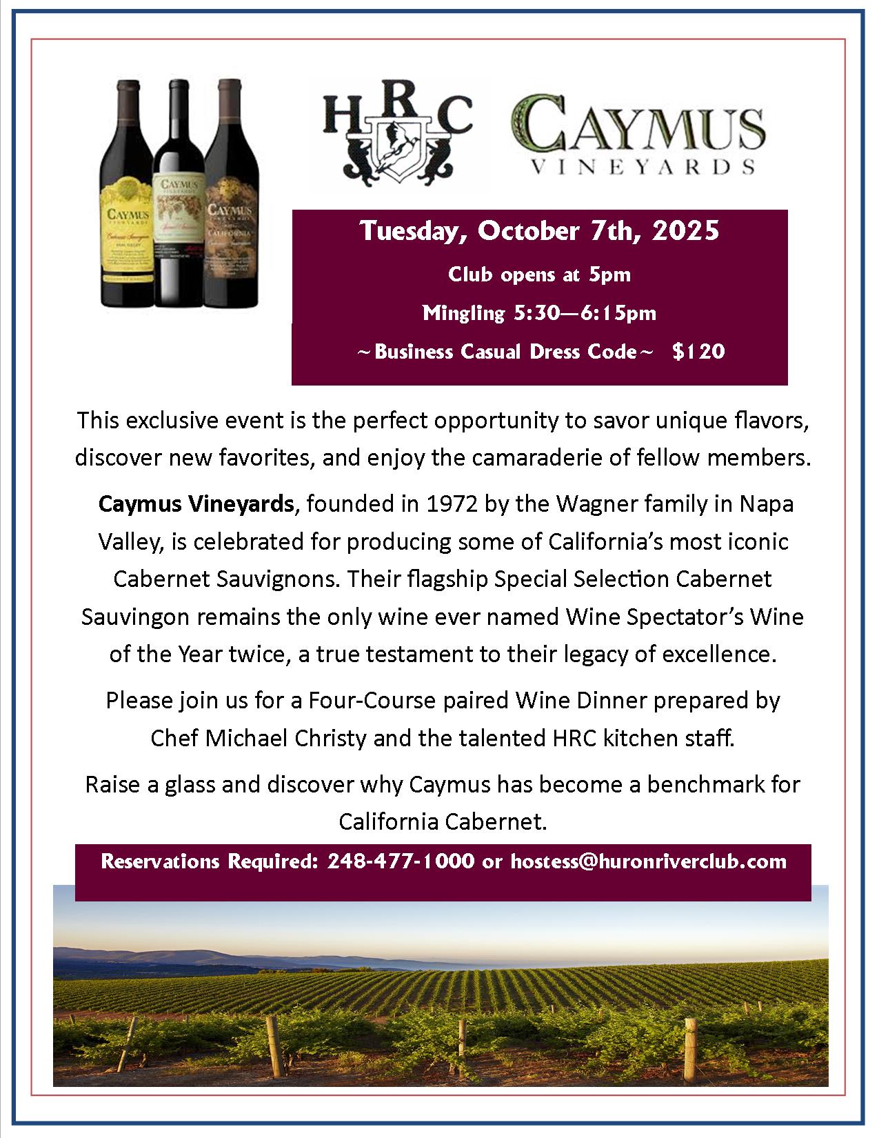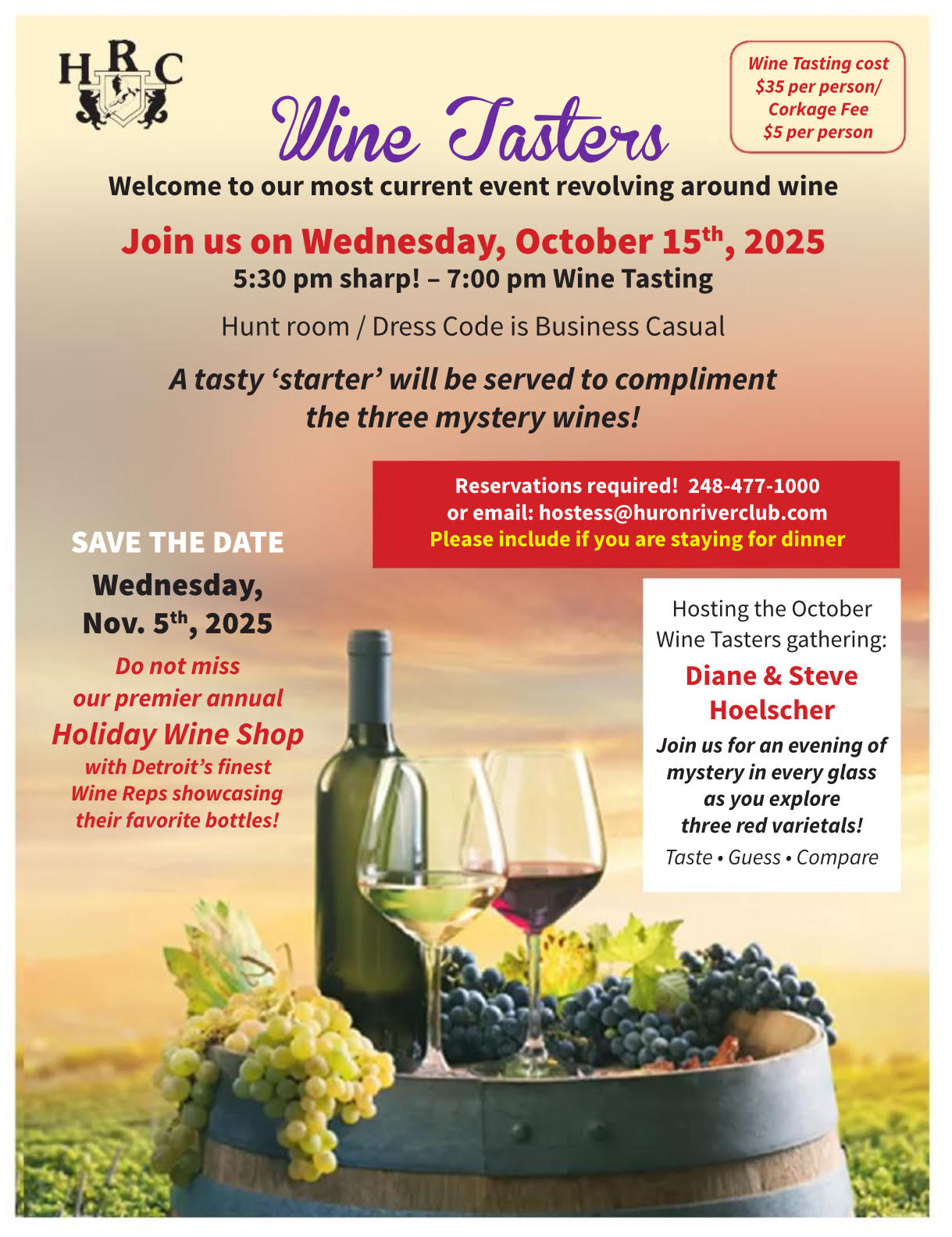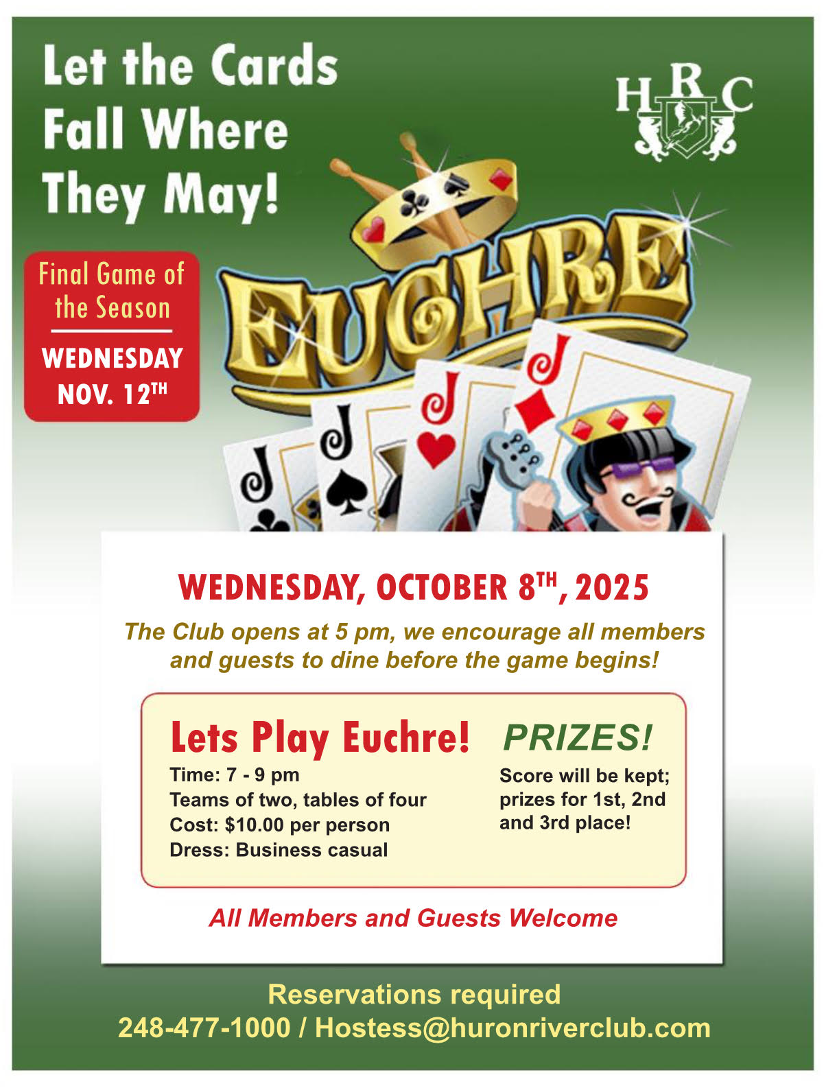 Sunday, November 2nd, 2025 from 2:00pm - 6:00pm Huron River Club Board of Directors, Management and Staff would like to invite you and your spouse (or friend) to a festive cocktail and Hors d'oeuvres reception featuring many of your favorite foods with a sweet table...