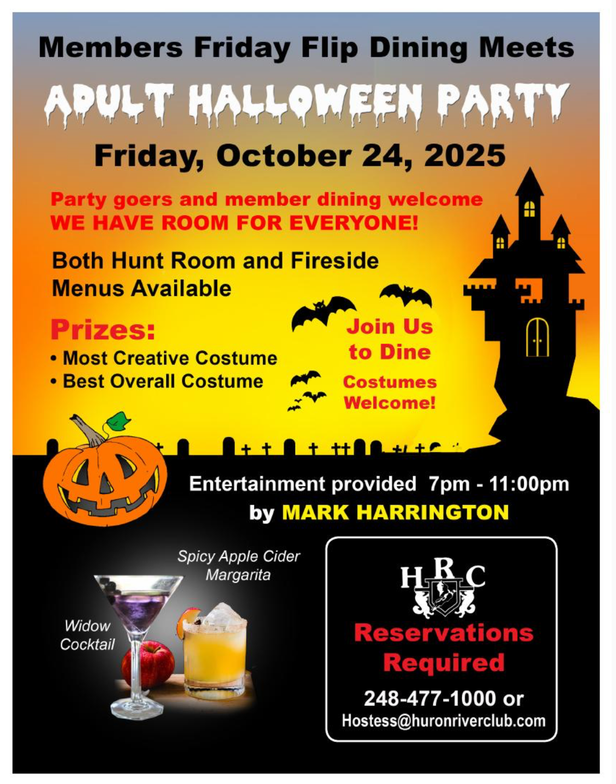 Adult Halloween Party, mixing in with regular member dining, with specialty drinks and costume prizes. Entertainment by Mark Harrington!